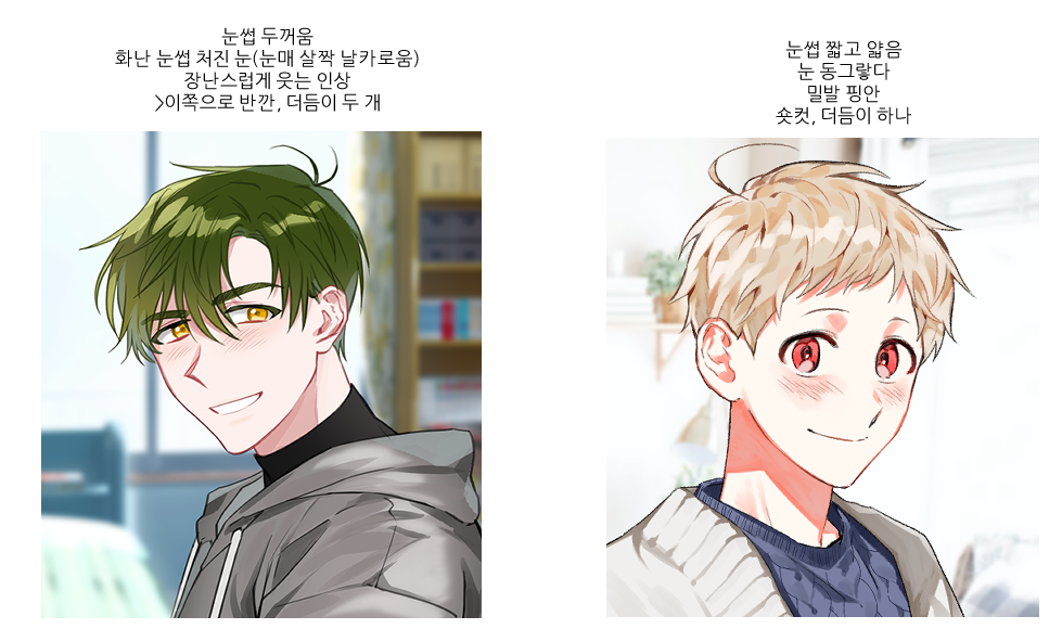- 눈 창으로 봤을 때 앞머리나 잔머리 등이 없어서 창이 빈 것처럼 나옴 (대머리, 올빽 등) 색조합이 자기 주장이 강함, ex : 태극 컬러 (파스텔톤으로 눌러드립니다만 원색을 원하실 경우 참고해주세요) - 식물이나 강한 빛 대비가 없는 실내, 방