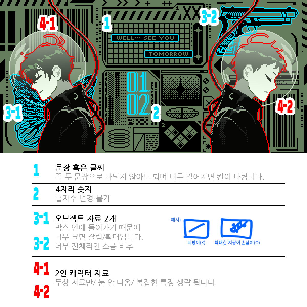 창1 (왼쪽 배경창) 파일명 (영어 대문자) : 창1에 들어갈 이미지 : 텍스트만 쓰셔도 상관없으나, (EX : 창1은 겨울의 산장으로 해주세요.) 이 경우 커다란 부분의 수정 요청 받지않습니다. 창2 (오른쪽 배경창) 파일명 (영어 대문자) : 창2에 들어갈 이미지 : 텍스트만 쓰셔도 상관없으나, (EX : 창1은 겨울의 산장으로 해주세요.) 이 경우 커다란 부분의 수정 요청 받지않습니다. 창3(아래의 손 잡은 이미지) 파일명 (영어 대문자) : 왼+오 소매 부분, 허벅지 일부(샘플참고)의 의상 자료 : 위의 캐릭터 자료에 첨부했을 경우 생략 가능